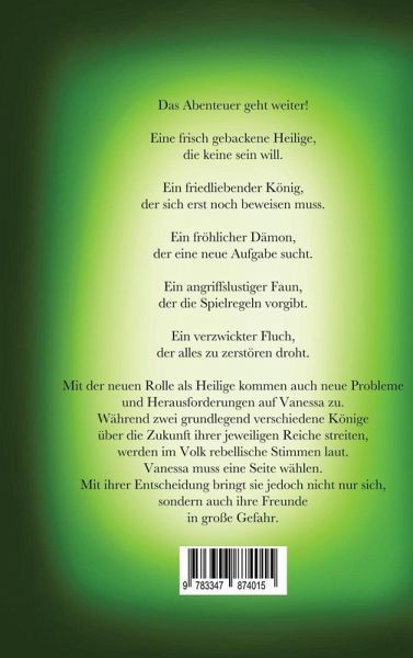 Das Abenteuer geht weiter!Eine frisch gebackene Heilige, die keine sein will.Ein friedliebender König, der sich erst noch beweisen muss.Ein fröhlicher Dämon, der eine neue Aufgabe sucht.Ein angriffslustiger Faun, der die Spielregeln vorgibt.Ein verzwickter Fluch, der alles zu zerstören droht.Mit der neuen Rolle als Heilige kommen auch neue Probleme und Herausforderungen auf Vanessa zu.Während zwei grundlegend verschiedene Könige über die Zukunft ihrer jeweiligen Reiche streiten, werden im Volk rebellische Stimmen laut. Vanessa muss eine Seite wählen. Mit ihrer Entscheidung bringt sie jedoch…mehr