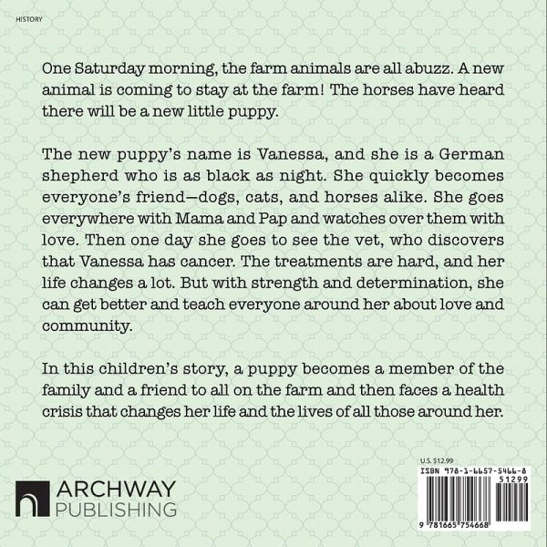 One Saturday morning, the farm animals are all abuzz. A new animal is coming to stay at the farm! The horses have heard there will be a new little puppy. The new puppy's name is Vanessa, and she is a German shepherd who is as black as night. She quickly becomes everyone's friend-dogs, cats, and horses alike. She goes everywhere with Mama and Pap and watches over them with love. Then one day she goes to see the vet, who discovers that Vanessa has cancer. The treatments are hard, and her life changes a lot. But with strength and determination, she can get better and teach everyone around her about love and community. In this children's story, a puppy becomes a member of the family and a friend to all on the farm and then faces a health crisis that changes her life and the lives of all those around her.