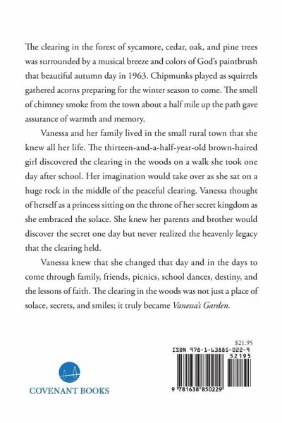The clearing in the forest of sycamore, cedar, oak, and pine trees was surrounded by a musical breeze and colors of God's paintbrush that beautiful autumn day in 1963. Chipmunks played as squirrels gathered acorns preparing for the winter season to come. The smell of chimney smoke from the town about a half mile up the path gave assurance of warmth and memory. Vanessa and her family lived in the small rural town that she knew all her life. The thirteen-and-a-half-year-old brown-haired girl discovered the clearing in the woods on a walk she took one day after school. Her imagination would take over as she sat on a huge rock in the middle of the peaceful clearing. Vanessa thought of herself as a princess sitting on the throne of her secret kingdom as she embraced the solace. She knew her parents and brother would discover the secret one day but never realized the heavenly legacy that the clearing held. Vanessa knew that she changed that day and in the days to come through family, friends, picnics, school dances, destiny, and the lessons of faith. The clearing in the woods was not just a place of solace, secrets, and smiles; it truly became Vanessa's Garden.