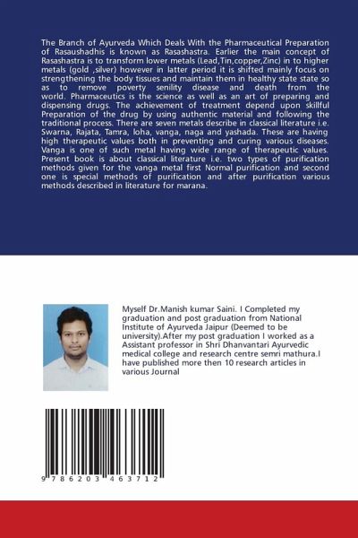 The Branch of Ayurveda Which Deals With the Pharmaceutical Preparation of Rasaushadhis is known as Rasashastra. Earlier the main concept of Rasashastra is to transform lower metals (Lead,Tin,copper,Zinc) in to higher metals (gold ,silver) however in latter period it is shifted mainly focus on strengthening the body tissues and maintain them in healthy state state so as to remove poverty senility disease and death from the world. Pharmaceutics is the science as well as an art of preparing and dispensing drugs. The achievement of treatment depend upon skillful Preparation of the drug by using authentic material and following the traditional process. There are seven metals describe in classical literature i.e. Swarna, Rajata, Tamra, loha, vanga, naga and yashada. These are having high therapeutic values both in preventing and curing various diseases. Vanga is one of such metal having wide range of therapeutic values. Present book is about classical literature i.e. two types of purification methods given for the vanga metal first Normal purification and second one is special methods of purification and after purification various methods described in literature for marana.