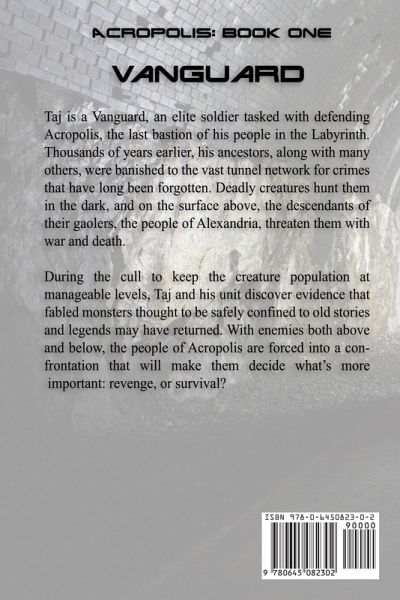 Taj is a Vanguard, an elite soldier tasked with defending Acropolis, the last bastion of his people in the Labyrinth. Thousands of years earlier, his ancestors, along with many others, were banished to the vast tunnel network for crimes that have long been forgotten. Deadly creatures hunt them in the dark, and on the surface above, the descendants of their gaolers, the people of Alexandria, threaten them with war and death. During the cull to keep the creature population at manageable levels, Taj and his unit discover evidence that fabled monsters thought to be safely confined to old stories and legends may have returned. With enemies both above and below, the people of Acropolis are forced into a confrontation that will make them decide what's more important, revenge, or survival.