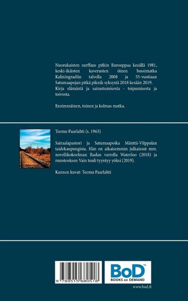 Nuorukaisten surffaus pitkin Eurooppaa kesällä 1981, keski-ikäisten kaverusten öinen bussimatka Kaliningradiin talvella 2008 ja 55-vuotiaan Satumaapojan pitkä piknik syksystä 2018 kesään 2019. Kirja elämästä ja sairastumisesta - toipumisesta ja toivosta. Ensimmäinen, toinen ja kolmas matka.