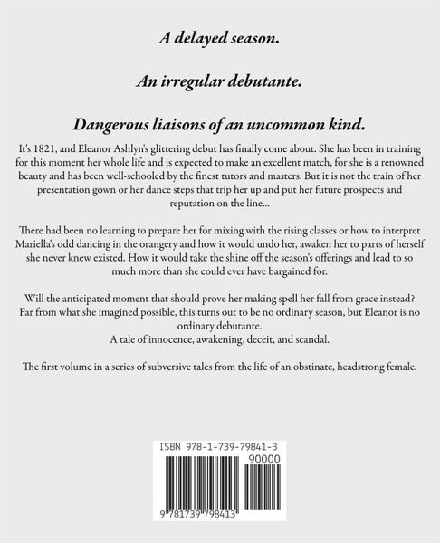 A delayed season. An irregular debutante. Dangerous liaisons of an uncommon kind. It's 1821 and Eleanor Ashlyn's glittering debut has finally come about. She has been in training for this moment her whole life and is expected to make an excellent match, for she is a renowned beauty and has been well-schooled by the finest tutors and masters. But it is not the train of her presentation gown, or her dance steps that trip her up and put her future prospects and reputation on the line... There had been no learning to prepare her for mixing with the rising classes, or how to interpret Mariella's odd dancing in the orangery and how it would undo her, awaken her to parts of herself she never knew existed. How it would take the shine off the season's offerings and lead to so much more than she could ever have bargained for. Will the anticipated moment that should prove her making, spell her fall from grace instead? Far from what she imagined possible, this turns out to be no ordinary season, but then, Eleanor is no ordinary debutante. A tale of innocence, awakening, deceit, and scandal. The first volume in a series of subversive tales from the life of an obstinate, headstrong female.