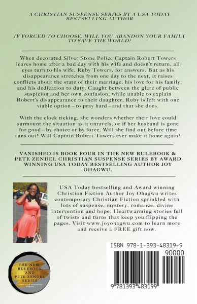 Acclaimed Christian Romantic Suspense series. If forced to choose, will you abandon your family to save the world? When decorated Silver Stone Police Captain Robert Towers leaves home after a bad day with his wife and doesn't return, all eyes turn to his wife, Ruby Towers, for answers. But as his disappearance stretches from one day to the next, it raises conflicts about the state of their marriage, his love for his family, and his dedication to duty. Caught between the glare of public suspicion and her own confusion, while unable to explain Robert's disappearance to their daughter, Ruby is left with one viable option-to pray hard-and that she does. With the clock ticking, she wonders whether their love could surmount the situation as it unravels, or if her husband is gone for good-by choice or by force. Will she find out before time runs out? Will Captain Robert Towers ever make it home again? Get exclusive access to a bonus deleted scene when you grab your copy today. The link is inside. Get your copy of VANISHED now.