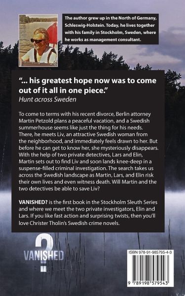 She: a very hot 30-something Swedish woman. He: a native of Berlin, on vacation in rural Sweden, seeking solace for his broken heart. They meet. He finds her irresistible. But before their relationship can get off the ground, she vanishes mysteriously, having apparently been abducted. So Martin sets out to rescue Liv from her captors, with the aid of two Swedish detectives in a race against time - and across Sweden. In so doing, Martin and his intrepid detective duo put their very lives on the line. Vanished? is the first book in the Stockholm Sleuth series and where we meet the two private investigators: Elin and Lars. If you like fast action and surprising twists, then you'll love Christer Tholin's Swedish crime novels.