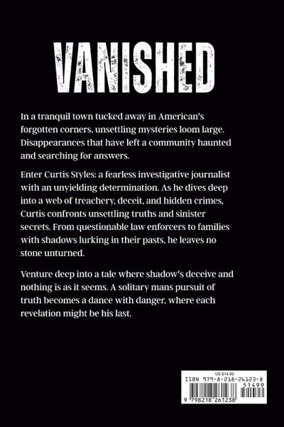 In a tranquil town tucked away in America's forgotten corners, unsettling mysteries loom large. Disappearances that have left a community haunted and searching for answers. Enter Curtis Styles: a fearless investigative journalist with an unyielding determination. As he dives deep into a web of treachery, deceit, and hidden crimes, Curtis confronts unsettling truths and sinister secrets. From questionable law enforcers to families with shadows lurking in their pasts, he leaves no stone unturned. Venture deep into a tale where shadows deceive and nothing is as it seems. A solitary man's pursuit of truth becomes a dance with danger, where each revelation might be his last.