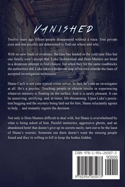 Twelve years ago fifteen people disappeared without a trace. Two private eyes and one psychic are determined to find out where and why. With no new leads or evidence, the case has landed in the cold case files but one family won't accept that. Luke Holmestead and Dom Masters are hired in a desperate attempt to find closure, but when they hit the same roadblocks the authorities did, Luke takes a desperate step of his own outside the lines of accepted investigation techniques. Shane Cayli is not your typical crime solver. In fact, he's not an investigator at all. He's a psychic. Touching people or objects results in experiencing whatever memory is floating on the surface. And it is rarely pleasant. It can be unnerving, terrifying, and, at times, life-threatening. Upon Luke's persistent begging and the mystery being laid out for him, Shane reluctantly agrees to help... and instantly regrets the decision. Not only is Dom Masters difficult to deal with, but Shane is overwhelmed by what is being asked of him. Painful memories, aggressive ghosts, and an abandoned hotel that doesn't give up its secrets easily, turn out to be the least of Shane's worries. Someone out there doesn't want the missing people found and they're willing to kill to keep the bodies hidden.