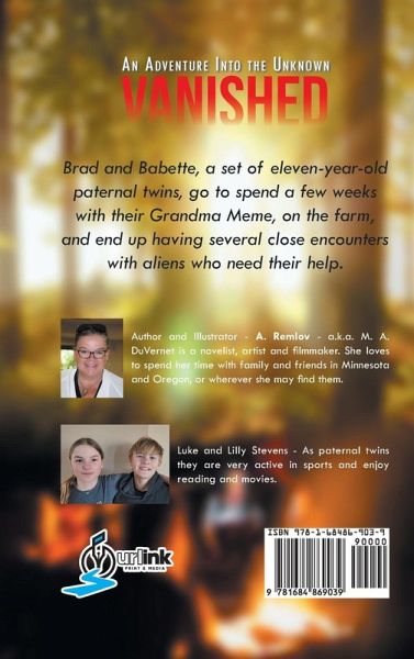 Brad and Babette, a set of eleven-year-old paternal twins, go to spend a few weeks with their Grandma Meme, on the farm, and end up having several close encounters with aliens who need their help. Author and Illustrator - A. Remlov - a.k.a. M. A. DuVernet is a novelist, artist and filmmaker. She loves to spend her time with family and friends in Minnesota and Oregon, or wherever she may find them. Luke and Lilly Stevens - As paternal twins they are very active in sports and enjoy reading and movies.