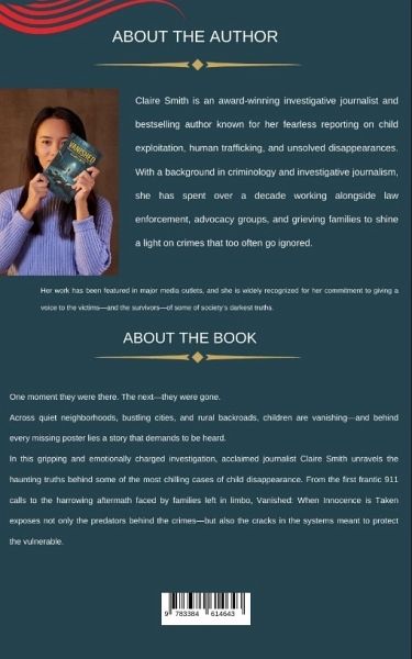 One moment they were there. The next-they were gone.Across quiet neighborhoods, bustling cities, and rural backroads, children are vanishing-and behind every missing poster lies a story that demands to be heard.In this gripping and emotionally charged investigation, acclaimed journalist Claire Smith unravels the haunting truths behind some of the most chilling cases of child disappearance. From the first frantic 911 calls to the harrowing aftermath faced by families left in limbo, Vanished: When Innocence is Taken exposes not only the predators behind the crimes-but also the cracks in the systems meant to protect the vulnerable.Through real-life case studies, psychological profiling, survivor testimonies, and in-depth analysis, Smith sheds light on a hidden epidemic-and the collective silence that allows it to persist.This is more than a true crime narrative. It is a call to awareness. A voice for the voiceless. And a plea to never forget the children who never came home.Because behind every statistic is a name. A face. A future stolen.