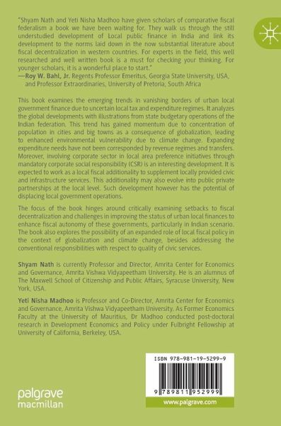 Chapter 1: Background and Emerging Challenges.- Chapter 2: Theory of Fiscal Federalism and Local Fiscal Domain.- Chapter 3: Fiscal Decentralization and Local Area Corporate Social Responsibility.- Chapter 4: Globalization, Climate Change and Changing Face of Urban Public Finance.- Chapter 5: Undermining Conventional User Charges.- Chapter 6: Grants in Aid and Bailouts in Municipal Finance.- Chapter 7: Off Budget Activities and Autonomous Specific Purpose Boards.- Chapter 8: Institutional Constraints on Local Fiscal Mobilisation.- Chapter 9: Limitations of Environmental Federalism: State vs Local Expenditure.- Chapter 10: Potential Local Taxes and Prospects for Municipal Bonds.- Chapter 11: Summary and Conclusion.