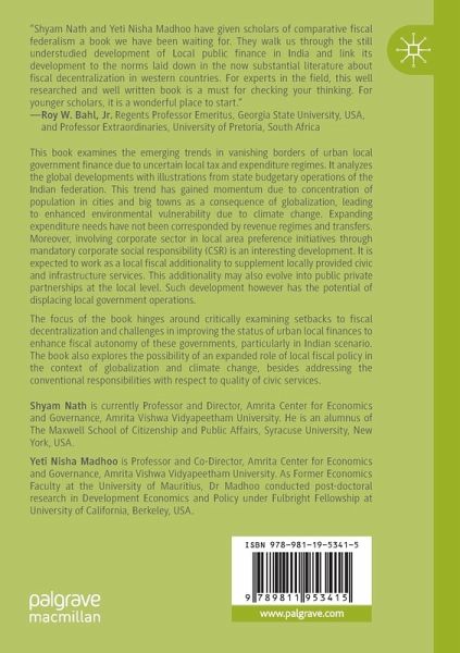 Chapter 1: Background and Emerging Challenges.- Chapter 2: Theory of Fiscal Federalism and Local Fiscal Domain.- Chapter 3: Fiscal Decentralization and Local Area Corporate Social Responsibility.- Chapter 4: Globalization, Climate Change and Changing Face of Urban Public Finance.- Chapter 5: Undermining Conventional User Charges.- Chapter 6: Grants in Aid and Bailouts in Municipal Finance.- Chapter 7: Off Budget Activities and Autonomous Specific Purpose Boards.- Chapter 8: Institutional Constraints on Local Fiscal Mobilisation.- Chapter 9: Limitations of Environmental Federalism: State vs Local Expenditure.- Chapter 10: Potential Local Taxes and Prospects for Municipal Bonds.- Chapter 11: Summary and Conclusion.