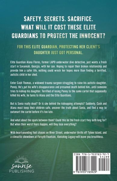 For this Elite Guardian, protecting her client's daughter just got personal. Elite Guardian Alana Flores, former LAPD underwater dive detective, just wants a fresh start in Savannah, Georgia, with her son. Hoping to repair their broken relationship and provide him a safer life, nothing could wreck her hopes more than finding a terrified, autistic child in her shed. Enter Cash Thomas, a widowed trauma surgeon struggling to raise his autistic daughter, Penny. He's put his wife's disappearance and presumed death behind him...until someone tries to kidnap his daughter. Terrified of losing Penny to the same cartel that supposedly killed his wife, he turns to Alana and the Elite Guardians. But is Sonia really dead? Or is she behind the kidnapping attempts? Suddenly, Cash and Alana must keep their children safe, uncover the truth about Sonia, and find a way to outsmart the cartel before it's too late. And what about the spark between them? Could this be the fresh start they both long for? But when their worst fears happen, will they lose everything? With heart-pounding foot chases on River Street, underwater thrills off Tybee Island, and a climactic showdown at Forsyth Fountain, Vanishing Legacy will leave you breathless. Elite Guardians: Savannah Book 1: Vanishing Legacy Book 2: Hunting Justice Book 3: Guarding Truth