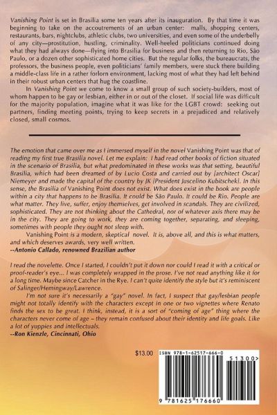 The story is placed in the 1970s in the new capital of Brasilia, and involves mostly gay and lesbian characters struggling to build a life in the socially barren but growing city. It has many turns of plot involving betrayal, reconciliation, "outings" and frustration, as well as moments of great beauty. It is told in the voices of four first-person narrators, the main characters, who alternate in telling the story from different points of view. The Brazilian writer and critic Antonio Callado has said: "Vanishing Point is a modern, skeptical novel. It is, above all-and this is what matters, what deserves awards-very well written." Ron Kienzle said: ..." Once I started, I couldn't put it down I was completely wrapped in the prose. I've not read anything like it for a long time. Maybe since Catcher in the Rye. I can't quite identify the style but it's reminiscent of Salinger/Hemingway/Lawrence.