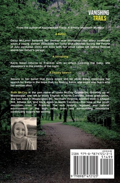 Vanishing Trails is the continuation of the story of Daisy McLaren and Jake Smith told in Appalachian Trails: A Smoky Mountain Mystery. It picks them up again during the Fourth of July weekend of the following year. Daisy is living with her small calico cat named Rescue above her father's garage; Jake is living on the family farm. Daisy still believes her mother had been murdered just before Daisy's graduation from UNC-Chapel Hill. A young woman, Keira Swan, returns to Franklin after a long absence, and she has with her an infant. Before she can explain herself, she disappears in the middle of…mehr