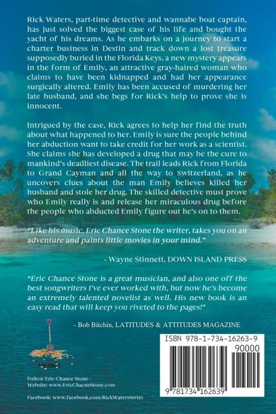 Rick Waters, part-time detective and wannabe boat captain, has just solved the biggest case of his life and bought the yacht of his dreams. As he embarks on a journey to start a charter business in Destin and track down a lost treasure supposedly buried in the Florida Keys, a new mystery appears in the form of Emily, an attractive gray-haired woman who claims to have been kidnapped and had her appearance surgically altered.. Emily has been accused of murdering her late husband, and she begs for Rick's help to prove she is innocent.Intrigued by the case, Rick agrees to help her find the truth about what happened to her. Emily is sure the people behind her abduction want to take credit for her work as a scientist. She claims she has developed a drug that may be the cure to mankind's deadliest disease. The trail leads Rick from Florida to Grand Cayman and all the way to Switzerland, as he uncovers clues about the man Emily believes killed her husband and stole her drug. The skilled detective must prove who Emily really is and release her miraculous drug before the people who abducted Emily figure out he's on to them. Rick will be have everything he needs to solve the case except, time. Get ready for a nonstop thrill ride!