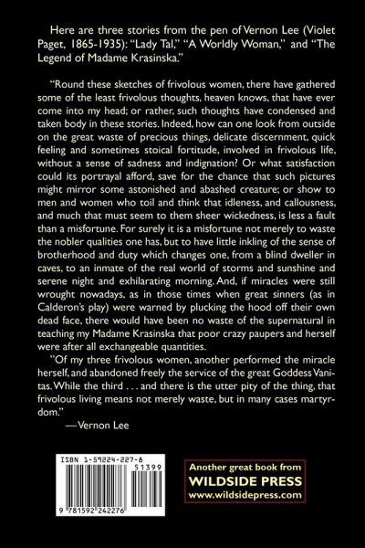 Here are three stories from the pen of Vernon Lee (Violet Paget, 1865-1935): "Lady Tal," "A Worldly Woman," and "The Legend of Madame Krasinska." "Round these sketches of frivolous women, there have gathered some of the least frivolous thoughts, heaven knows, that have ever come into my head; or rather, such thoughts have condensed and taken body in these stories. Indeed, how can one look from outside on the great waste of precious things, delicate discernment, quick feeling and sometimes stoical fortitude, involved in frivolous life, without a sense of sadness and indignation? Or what satisfaction could its portrayal afford, save for the chance that such pictures might mirror some astonished and abashed creature; or show to men and women who toil and think that idleness, and callousness, and much that must seem to them sheer wickedness, is less a fault than a misfortune. For surely it is a misfortune not merely to waste the nobler qualities one has, but to have little inkling of the sense of brotherhood and duty which changes one, from a blind dweller in caves, to an inmate of the real world of storms and sunshine and serene night and exhilarating morning. And, if miracles were still wrought nowadays, as in those times when great sinners (as in Calderon's play) were warned by plucking the hood off their own dead face, there would have been no waste of the supernatural in teaching my Madame Krasinska that poor crazy paupers and herself were after all exchangeable quantities. "Of my three frivolous women, another performed the miracle herself, and abandoned freely the service of the great Goddess Vanitas. While the third ... and there is the utter pity of the thing, that frivolous living means not merely waste, but in many cases martyrdom. "That fact, though it had come more than once before my eyes, would perhaps never have been clear to my mind, but for our long talks together about what people are and might be. A certain indignation verging on hatred might have made these stories of min utterly false and useless, but for the love of all creatures who may suffer with which you lit up the subject. And for this reason the proof sheets of my little book must go first to that old bishop's villa on the lowest Apennine spur, where the chestnuts are dropping, with a sound of rustling silk, on to the sere leaves below, and the autumn rain storms are rushing by, veiling the plain with inky crape, blotting out that distant white shimmer, which, in the sunlight, was Florence a moment ago." -- Vernon Lee