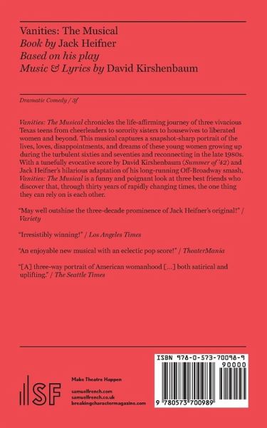 Vanities: The Musical chronicles the life-affirming journey of three vivacious Texas teens from cheerleaders to sorority sisters to housewives to liberated women and beyond. This musical captures a snapshot-sharp portrait of the lives, loves, disappointments, and dreams of these young women growing up during the turbulent sixties and seventies and reconnecting in the late 1980s. With a tunefully evocative score by David Kirshenbaum (Summer of '42) and Jack Heifner's hilarious adaptation of his long-running Off-Broadway smash, Vanities: The Musical is a funny and poignant look at three best friends who discover that, through thirty years of rapidly changing times, the one thing they can rely on is each other.