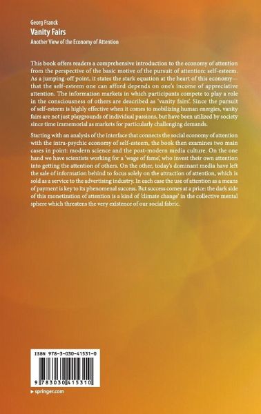 This book offers readers a comprehensive introduction to the economy of attention from the perspective of the basic motive of the pursuit of attention: self-esteem. As a jumping-off point, it states the stark equation at the heart of this economy- that the self-esteem one can afford depends on one's income of appreciative attention. The information markets in which participants compete to play a role in the consciousness of others are described as 'vanity fairs'. Since the pursuit of self-esteem is highly effective when it comes to mobilizing human energies, vanity fairs are not just playgrounds of individual passions, but have been utilized by society since time immemorial as markets for particularly challenging demands.