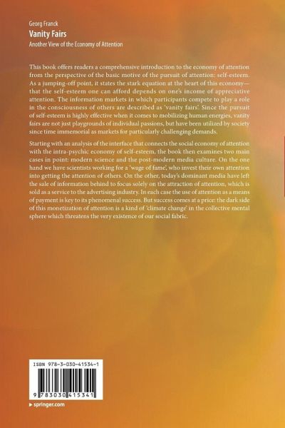 This book offers readers a comprehensive introduction to the economy of attention from the perspective of the basic motive of the pursuit of attention: self-esteem. As a jumping-off point, it states the stark equation at the heart of this economy- that the self-esteem one can afford depends on one's income of appreciative attention. The information markets in which participants compete to play a role in the consciousness of others are described as 'vanity fairs'. Since the pursuit of self-esteem is highly effective when it comes to mobilizing human energies, vanity fairs are not just playgrounds of individual passions, but have been utilized by society since time immemorial as markets for particularly challenging demands.