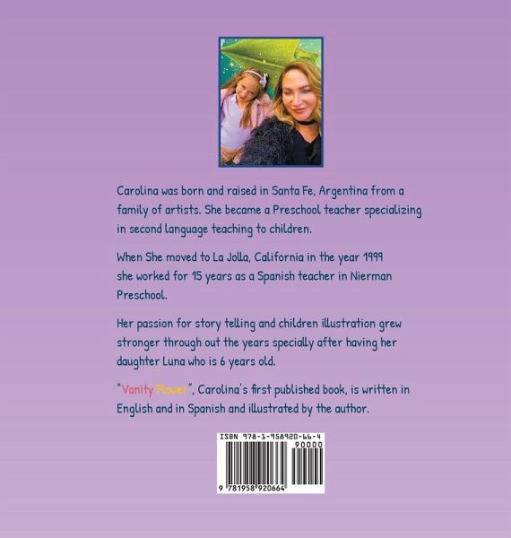 Carolina was born and raised in Santa Fe, Argentina from a family of artists. She became a Preschool teacher specializing in second language teaching to children. When She moved to La Jolla, California in the year 1999 she worked for 15 years as a Spanish teacher in Nierman Preschool. Her passion for storytelling and children illustration grew stronger throughout the years specially after having her daughter Luna who is 6 years old. "Vanity Flower", Carolina's first published book, is written in English and in Spanish and illustrated by the author.