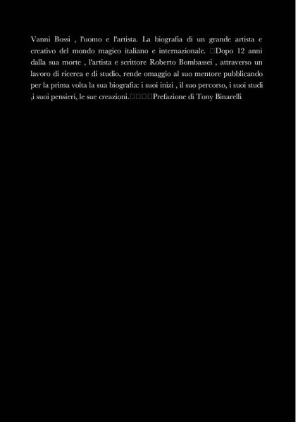 Vanni Bossi , l'uomo e l'artista. La biografia di un grande artista e creativo del mondo magico italiano e internazionale. Dopo 12 anni dalla sua morte , l'artista e scrittore Roberto Bombassei , attraverso un lavoro di ricerca e di studio, rende omaggio al suo mentore pubblicando per la prima volta la sua biografia: i suoi inizi , il suo percorso, i suoi studi ,i suoi pensieri, le sue creazioni. Prefazione di Tony Binarelli