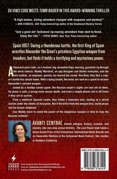 DA VINCI CODE meets TOMB RAIDER in this award-winning thriller that #1 NYT bestselling author James Rollins called, "A book that defines 'page-turner.'" ¿¿¿Spain 1057: During a thunderous battle, the first King of Aragon wrestles Alexander the Great's priceless Egyptian weapon from the Moors, but finds it holds a terrifying and mysterious power. Nearly a thousand years later, on a fog-shrouded Napa Valley morning, gunshots and the clatter of breaking glass rip through the silence. Maddy Marshall, an app designer with special martial-arts abilities, and her twin brother, Will Argones, quickly run toward the sound. Horrified, they discover a sniper has cut down two members of their family. Before the pool of blood on the living room floor is dry, their father sends the twins on a dangerous quest to recover Alexander's ancient weapon. Joined by a broad-shouldered friend who harbors a secret alliance with VanOps, an ultra-black covert agency, they soon discover the lethal sniper is from Russia. They follow time-worn clues from a medieval Spanish castle to a lost warren under the streets of Jerusalem, racing to unlock the secrets that will lead them to an arcane power--before a hostile state seizes the power and cripples the United States. To survive, they must go undercover and off-grid. No place is safe, a wrong move means death, and even a simple phone call is off limits. Because now, the sniper has his sights set on them. Fans of Dan Brown, Clive Cussler, Steve Berry, and James Rollins will devour the pages of this instant #1 Barnes and Noble best seller. THE LOST POWER is the first book in the fast-paced, multi-award-winning VanOps thriller series. If you enjoy smart edge-of-your-seat suspense, you'll stay up late turning the pages of Avanti Centrae's high-stakes novel. ¿¿- Genre Grand Prize blue ribbon winner at the Chanticleer International Book Awards - Honorable Mention winner at the Hollywood Book Festival - Bronze Medal winner at the Wishing Shelf Book Awards "Avanti Centrae's VanOps: The Lost Power opens a tantalizing new series that combines historical mystery and cutting-edge science into a masterwork of international intrigue--with the promise of more to follow. Don't miss this riveting debut!" ~ James Rollins, the #1 New York Times bestselling author of Crucible "...a good ole' fashioned rip-roaring adventure from start to finish. Enjoy the ride." ~ Steve Berry, New York Times bestselling author