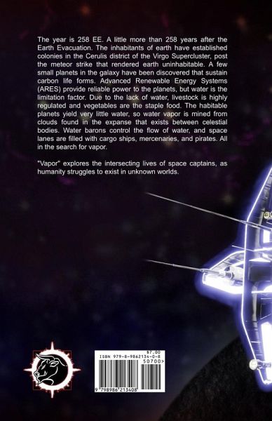 The year is 258 EE. A little more than 258 years after the Earth Evacuation. The inhabitants of earth have established colonies in the Cerulis district of the Virgo Supercluster, post the meteor strike that rendered earth uninhabitable. A few small planets in the galaxy have been discovered that sustain carbon life forms. Advanced Renewable Energy Systems (ARES) provide reliable power to the planets, but water is the limitation factor. Due to the lack of water, livestock is highly regulated and vegetables are the staple food. The habitable planets yield very little water, so water vapor is mined from clouds found in the expanse that exists between celestial bodies. Water barons control the flow of water, and space lanes are filled with cargo ships, mercenaries, and pirates. All in the search for vapor. "Vapor" explores the intersecting lives of space captains, as humanity struggles to exist in unknown worlds.
