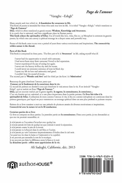 "Varaghe -Eshgh" Many people seek love, which is a foundation for awareness in life. This book of poems is intended for those who seek true love in life. It is titled "Varaghe -Eshgh," which translates in English to "Pages of Love." Irfan, which is often translated as gnosis, means wisdom, knowledge, awareness or enlightenment. It is a path that is universal, and has a significant place in Persian poetry. This book echoes the spirituality of Irfan. Use of words like love, wine, fire etc. as metaphors is common in gnostic poems, by which one can convey a spiritual message in a more powerful way. Poems of this book came to me over a period of years from various motivations and inspirations. The connectivity in nature and my appreciation is the common thread. Parts of this Book This book is composed in two parts. The first part of this book is basically observation and experimentation. In this part I was asking myself what my life would look like, if: I never had the opportunity to attach with someone. I had never been away from someone I loved to feel separation. I never experienced the joy of seeing her again. I never saw the beauty in blue sky and the ocean. I could never see awesome existence of stars in black sky. I spent my life in hate and animosity and greed. I couldn't hear the sound of music. I couldn't tell the difference between good and evil. The second part reflects my appreciation of life and all that I have. My motivation was my longing for fire to touch my soul and burn my desires, to bring me awareness in life and live in my heart forever.