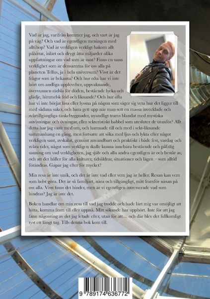 Vad är jag, varifrån kommer jag, och vart är jag på väg? Och vad är egentligen meningen med alltihop? Vad är verkligen verkligt bakom allt påhittat, inlärt och drygt åtta miljarder olika uppfattningar om vad som är sant? Finns en sann verklighet som är densamma för oss alla på planeten Tellus, ja i hela universum? Visst är det frågor som är bekanta? Och hur ofta har vi inte hört om andliga upplevelser, uppvaknande, övervunnen rädsla för döden, bestående lycka och glädje, himmelsk frid och liknande? Och hur ofta har vi inte börjat läsa eller lyssna på någon som säger sig veta hur det ligger till med sådana saker, och bara gett upp när man sett en massa invecklade och svårtillgängliga tankebyggnader, nyandligt trams blandat med mystiska anvisningar och övningar, eller sekteristiskt babbel som utesluter de utanför? Allt detta har jag varit med om, och hamnade till och med i sekt-liknande sammanhang en gång, men fortsatte att söka med ljus och lykta efter något verkligen sant, avskalat, genuint användbart och praktiskt i både fest, vardag och svåra tider, något som skulle kunna innebära verkligt bestående och pålitlig sanning om vad verkligheten, jag själv och alla andra egentligen är och består av, och att det håller för alla kulturer, tidsåldrar, situationer och lägen - som alltid förändras. Gapar jag efter för mycket? Min resa är inte unik, och det är inte vad eller vem jag är heller. Resan kan vem som helst göra. Det är så familjärt, nära och tillgängligt, mitt framför näsan på oss alla. Visst finns det hinder, men är vi egentligen intresserade vad som hindrar? Jag är inte det. Boken handlar om min resa till vad jag trodde och hade lärt mig var omöjligt att hitta, komma fram till eller uppnå. Mitt sökande har upphört. Inte för att jag fann någonting av det jag letade efter, utan för att... och där blev det fullkomligt tyst ett långt tag. Tills denna bok kom till.