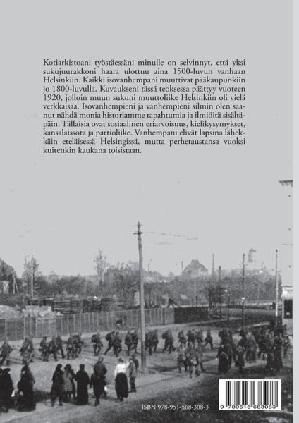 Kotiarkistoani työstäessäni minulle on selvinnyt, että yksi sukujuurakkoni haara ulottuu aina 1500-luvun vanhaan Helsinkiin. Kaikki isovanhempani muuttivat pääkaupunkiin jo 1800-luvulla. Kuvaukseni tässä teoksessa päättyy vuoteen 1920, jolloin muun sukuni muuttoliike Helsinkiin oli vielä verkkaisaa. Isovanhempieni ja vanhempieni silmin olen saanut nähdä monia historiamme tapahtumia ja ilmiöitä sisältäpäin. Tällaisia ovat sosiaalinen eriarvoisuus, kielikysymykset, kansalaissota ja partioliike. Vanhempani elivät lapsina lähekkäin eteläisessä Helsingissä, mutta perhetaustansa vuoksi kuitenkin…mehr