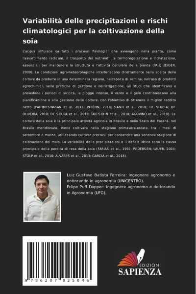 L'acqua influisce su tutti i processi fisiologici che avvengono nella pianta, come l'assorbimento radicale, il trasporto dei nutrienti, la termoregolazione e l'idratazione, essenziali per mantenere la struttura e l'attività cellulare della pianta (TAIZ; ZEIGER, 2009). Le condizioni agrometeorologiche interferiscono direttamente nella scelta delle colture da produrre in una determinata regione, nell'epoca di semina, nell'uso di prodotti agrochimici, nelle pratiche di gestione e nell'irrigazione. Gli studi che identificano e prevedono i periodi di siccità, le piogge intense, il vento e il gelo contribuiscono alla pianificazione e alla gestione delle colture, con l'obiettivo di ottenere il miglior reddito netto (PATHMESWARAN et al. 2018; WIRÉHN, 2018; SANTI et al, 2018; DE SOUSA; DE OLIVEIRA, 2018; DE SOUZA et al., 2018; TAYT'SOHN et al., 2018; AGOVINO et al., 2019). La coltura della soia è la principale attività agricola in Brasile e nello Stato del Paraná, nel Brasile meridionale. Viene coltivata nella stagione primavera-estate, tra i mesi di settembre e marzo, utilizzando cultivar precoci, per consentire una seconda stagione di coltivazione del mais. La variabilità delle precipitazioni e il deficit idrico sono la causa principale della perdita di resa della soia (FARIAS et al., 1997; PEDERSEN; LAUER, 2004; STÜLP et al., 2010; ALVARES et al., 2013; GARCIA et al., 2018).