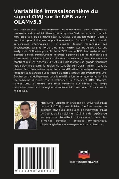 Les phénomènes atmosphériques intrasaisonniers sont d'importants modulateurs des précipitations en Amérique du Sud, en particulier dans le nord du Brésil, où se trouve l'État du Ceará. L'oscillation Madden-Julian, à son tour, peut influencer le positionnement et l'intensité de la zone de convergence intertropicale - le principal facteur responsable des précipitations dans le nord-est du Brésil (NEB). Cet article présente une analyse de l'influence possible de la ZCIT sur le NEB. Les analyses sont décrites à l'aide d'observations obtenues à partir du site de données de la NOAA, ainsi qu'à l'aide d'une modélisation numérique globale. Les résultats montrent que les années 2002 et 2003 présentent une grande variabilité intra-saisonnière dans la région de contrôle de l'Océan Indien - tant au niveau des observations que de la modélisation numérique, avec une influence considérable sur la région du NEB associée aux événements OMJ. D'autre part, spécifiquement pour la modélisation numérique, en utilisant la méthodologie discutée pour sélectionner un événement OMJ aléatoire, l'année 2011 a montré une forte variabilité sur l'échelle de temps intrasaisonnière dans la région de contrôle INDI, avec une influence sur la région NEB.