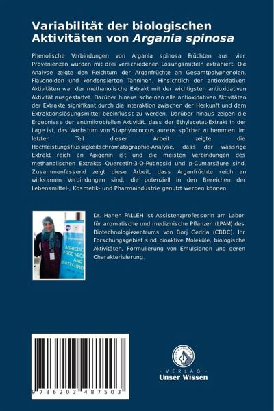 Phenolische Verbindungen von Argania spinosa Früchten aus vier Provenienzen wurden mit drei verschiedenen Lösungsmitteln extrahiert. Die Analyse zeigte den Reichtum der Arganfrüchte an Gesamtpolyphenolen, Flavonoiden und kondensierten Tanninen. Hinsichtlich der antioxidativen Aktivitäten war der methanolische Extrakt mit der wichtigsten antioxidativen Aktivität ausgestattet. Darüber hinaus scheinen alle antioxidativen Aktivitäten der Extrakte signifikant durch die Interaktion zwischen der Herkunft und dem Extraktionslösungsmittel beeinflusst zu werden. Darüber hinaus zeigen die Ergebnisse der antimikrobiellen Aktivität, dass der Ethylacetat-Extrakt in der Lage ist, das Wachstum von Staphylococcus aureus spürbar zu hemmen. Im letzten Teil dieser Arbeit zeigte die Hochleistungsflüssigkeitschromatographie-Analyse, dass der wässrige Extrakt reich an Apigenin ist und die meisten Verbindungen des methanolischen Extrakts Quercetin-3-O-Rutinosid und p-Cumarsäure sind. Zusammenfassend zeigt diese Arbeit, dass Arganfrüchte reich an wirksamen Verbindungen sind, die potenziell in den Bereichen der Lebensmittel-, Kosmetik- und Pharmaindustrie genutzt werden können.