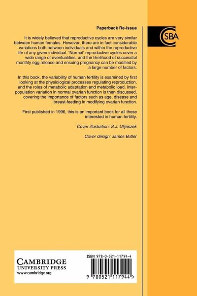 It is widely believed that reproductive cycles are very similar between human females. However, there are in fact considerable variations both between individuals and within the reproductive life of any given individual. 'Normal' reproductive cycles cover a wide range of eventualities, and the likelihood of successful monthly egg release and ensuing pregnancy can be modified by a large number of factors. In this book, the variability of human fertility is examined by first looking at the physiological processes regulating reproduction, and the roles of metabolic adaptation and metabolic load. Inter-population variation in normal ovarian function is then discussed, covering the importance of factors such as age, disease and breastfeeding in modifying ovarian function. First published in 1996, this is an important book for all those interested in human fertility.