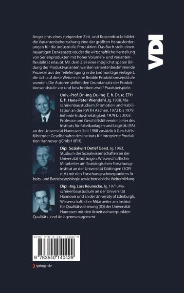 Prof. Dr.-Ing. Dr.-Ing. e.h. Hans-Peter WIENDAHL, Jahrgang 1938, ist bereits bei vielen Veröffentlichungen im Springer-Verlag als Herausgeber und Autor tätig geworden. Er ist geschäftsführender Leiter des Institut für Fabrikanlagen (IFA) an der Universität Hannover. Tätigkeitsschwerpunkte/Kernkompetenzen: Modellierung, Simulation und Evaluation von Produktionssystemen. Erfahrungen: Gutachter mehrerer Forschungsförderer, Mitglied der Wissenschaftlichen Gesellschaft für Produktionstechnik (WGP), der Internationalen Forschungsgemeinschaft für Mechanische Produktionstechnik (CIRP) sowie der International Federation of Information Processing (IFIP); zahlreiche Auszeichnungen und Ehrenmitgliedschaften. Dipl. Sozialwirt Detlef Gerst, Jahrgang 1963, absolvierte an der Universität Göt-tingen ein Studium der Sozialwissenschaften. Er arbeitet als Wissenschaftlicher Mitarbeiter am Soziologischen Forschungsinstitut an der Universität Göttingen (SOFI e. V.). Seine Forschungsschwerpunkte liegen in den Bereichen Arbeits- und Betriebssoziologie sowie betriebliche Weiterbildung. Dipl.-Ing. Lars Keunecke, Jahrgang 1971, absolvierte ein Maschinenbaustudium an der Universität Hannover und an der University of Edinburgh. Er arbeitet als Wissenschaftlicher Mitarbeiter am Institut für Qualitätssicherung (IQ) der Universität Hannover. Seine Arbeitsschwerpunkte liegen in den Bereichen Qualitäts- und Anlagenmanagement.