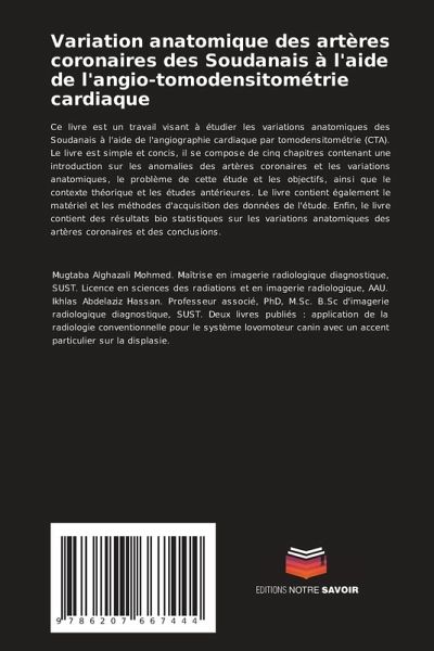 Ce livre est un travail visant à étudier les variations anatomiques des Soudanais à l'aide de l'angiographie cardiaque par tomodensitométrie (CTA). Le livre est simple et concis, il se compose de cinq chapitres contenant une introduction sur les anomalies des artères coronaires et les variations anatomiques, le problème de cette étude et les objectifs, ainsi que le contexte théorique et les études antérieures. Le livre contient également le matériel et les méthodes d'acquisition des données de l'étude. Enfin, le livre contient des résultats bio statistiques sur les variations anatomiques des artères coronaires et des conclusions.