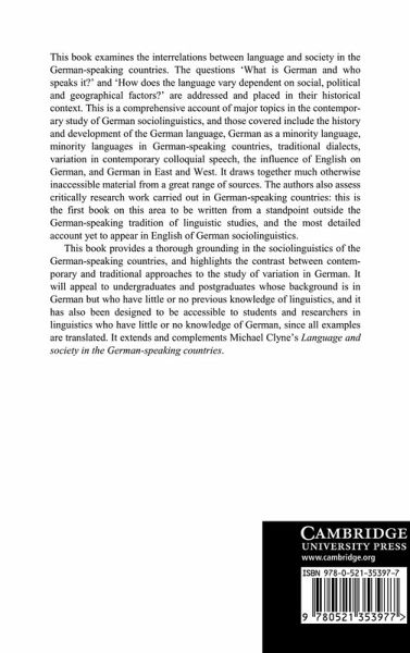 This book examines the interrelations between language and society in the German-speaking countries. The questions 'what is German and who speaks it?' and 'how does the language vary dependent on social, political and geographical factors?' are addressed and placed in their historical context. This is a comprehensive account of major topics in the contemporary study of German sociolinguistics, and topics covered include the history and development of the German language, German as a minority language, minority languages in German-speaking countries, traditional dialects, variation in contemporary colloquial speech, the influence of English on German, and German in East and West. It draws together much otherwise inaccessible material from a great range of sources. The authors also assess critically research work carried out in German-speaking countries.