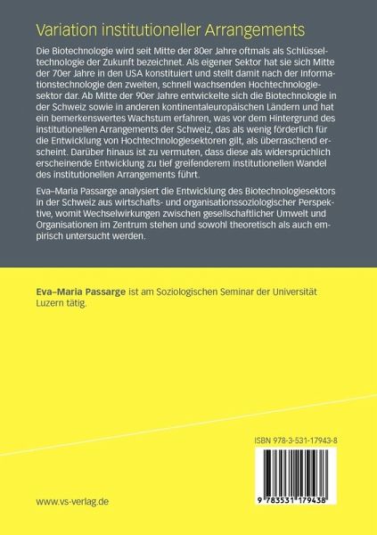 Eva-Maria Passarge analysiert die Entwicklung des Biotechnologiesektors in der Schweiz aus wirtschafts- und organisationssoziologischer Perspektive, womit Wechselwirkungen zwischen gesellschaftlicher Umwelt und Organisationen im Zentrum stehen und sowohl theoretisch als auch empirisch untersucht werden.