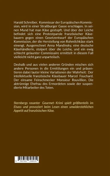 Harald Schreiber, Kommissar der Europäischen Kommission, wird in einer Straßburger Gasse erschlagen. In seinen Mund hat man Käse gestopft. Und über der Leiche befindet sich eine Protestparole französischer Käsebauern gegen einen Gesetzentwurf der Europäischen Kommission, der die Herstellung von Rohmilchkäse stark einengt. Ausgerechnet Anna Mandinsky, eine deutsche Käsehändlerin, stolpert über die Leiche. Ein ewig schlecht gelaunter Commissaire ermittelt in diesem Fall vielleicht nicht ganz unparteiisch. Deshalb und aus vielen anderen Gründen mischen sich andere Personen in die Ermittlungen ein und präsentieren lauter kleine Variationen der Wahrheit: Der intellektuelle französische Käsebauer Marcel Fouchard, der einsame Feinschmecker Monsieur Rouvillion. Die abtrünnige Ehefrau des Ermordeten sowie der suspendierte Mitarbeiter des Toten. Sternbergs rasanter Gourmet-Krimi spielt größtenteils im Elsass und provoziert beim Lesen einen unwiderstehlichen Appetit auf französischen Käse.