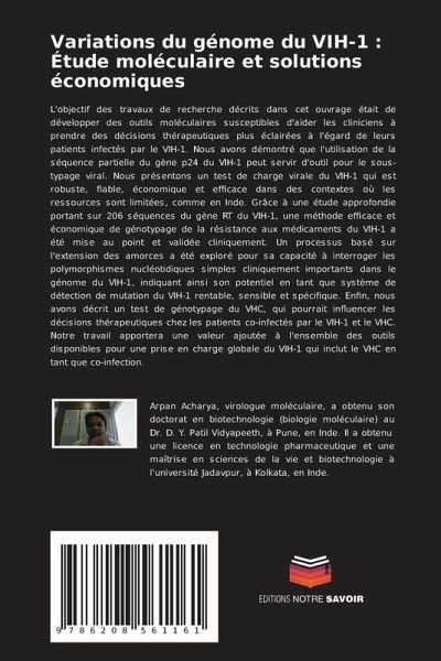 L'objectif des travaux de recherche décrits dans cet ouvrage était de développer des outils moléculaires susceptibles d'aider les cliniciens à prendre des décisions thérapeutiques plus éclairées à l'égard de leurs patients infectés par le VIH-1. Nous avons démontré que l'utilisation de la séquence partielle du gène p24 du VIH-1 peut servir d'outil pour le sous-typage viral. Nous présentons un test de charge virale du VIH-1 qui est robuste, fiable, économique et efficace dans des contextes où les ressources sont limitées, comme en Inde. Grâce à une étude approfondie portant sur 206 séquences du gène RT du VIH-1, une méthode efficace et économique de génotypage de la résistance aux médicaments du VIH-1 a été mise au point et validée cliniquement. Un processus basé sur l'extension des amorces a été exploré pour sa capacité à interroger les polymorphismes nucléotidiques simples cliniquement importants dans le génome du VIH-1, indiquant ainsi son potentiel en tant que système de détection de mutation du VIH-1 rentable, sensible et spécifique. Enfin, nous avons décrit un test de génotypage du VHC, qui pourrait influencer les décisions thérapeutiques chez les patients co-infectés par le VIH-1 et le VHC. Notre travail apportera une valeur ajoutée à l'ensemble des outils disponibles pour une prise en charge globale du VIH-1 qui inclut le VHC en tant que co-infection.