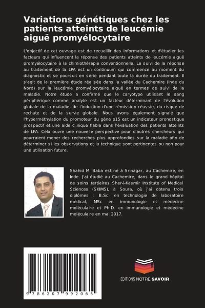 L'objectif de cet ouvrage est de recueillir des informations et d'étudier les facteurs qui influencent la réponse des patients atteints de leucémie aiguë promyélocytaire à la chimiothérapie conventionnelle. Le suivi de la réponse au traitement de la LPA est un continuum qui commence au moment du diagnostic et se poursuit en série pendant toute la durée du traitement. Il s'agit de la première étude réalisée dans la vallée du Cachemire (Inde du Nord) sur la leucémie promyélocytaire aiguë en termes de suivi de la maladie. Notre étude a confirmé que le caryotype utilisant le sang périphérique comme analyte est un facteur déterminant de l'évolution globale de la maladie, de l'induction d'une rémission réussie, du risque de rechute et de la survie globale. Nous avons également signalé que l'hyperméthylation du promoteur du gène p15 est un indicateur pronostique prospectif et une aide clinique fiable dans l'évaluation des patients atteints de LPA. Cela ouvre une nouvelle perspective pour d'autres chercheurs qui pourraient mener des recherches plus approfondies sur la maladie afin de déterminer si les observations et la technique sont pertinentes ou non pour une utilisation future.