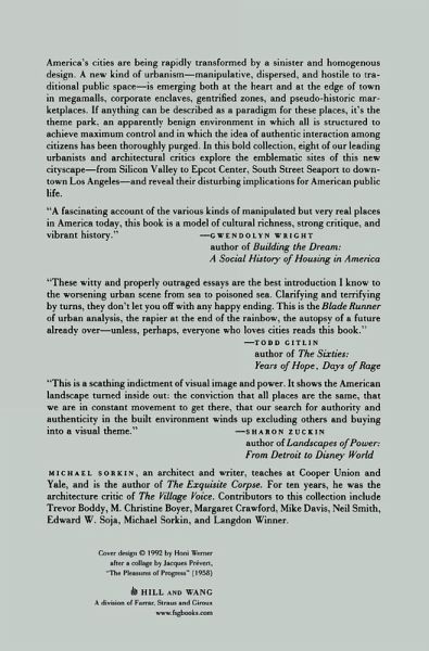 America's cities are being rapidly transformed by a sinister and homogenous design. A new Kind of urbanism--manipulative, dispersed, and hostile to traditional public space--is emerging both at the heart and at the edge of town in megamalls, corporate enclaves, gentrified zones, and psuedo-historic marketplaces. If anything can be described as a paradigm for these places, it's the theme park, an apparently benign environment in which all is structured to achieve maximum control and in which the idea of authentic interaction among citizens has been thoroughly purged. In this bold collection, eight of our leading urbanists and architectural critics explore the emblematic sites of this new cityscape--from Silicon Valley to Epcot Center, South Street Seaport to downtown Los Angeles--and reveal their disturbing implications for American public life.