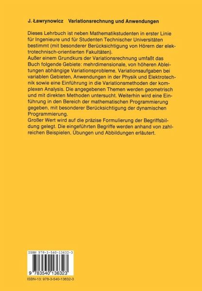 1. Elemente der Variationsrechnung.- 1.1 Eine elementare Einführung in Extremalprobleme.- 1.2 Die einfachste Variationsaufgabe; notwendige Bedingungen: Die Eulersche Gleichung.- 1.3 Das isoperimetrische Problem als Extremwertaufgabe unter Nebenbedingungen. Eine Anwendung der Lagrange'schen Multiplikatoren.- 1.4 Hinreichende Bedingungen zur Existenz schwacher Extrema.- 1.5 Einführung in die Theorie der starkenx Extrema. Die Hamilton-Jakobi'sche Gleichung.- 1.6 Funktionalanalytische Grundlagen der Variationsrechnung.- 1.7 Funktionale und Operatoren in Banach- und Hilbert-Räumen.- 1.8 Die Verallgemeinerung der einfachsten Variationsaufgabe auf Banach- und Hilbert-Räumen.- 2. Mehrdimensionale, von höheren Ableitungen abhängige Variationsprobleme oder Probleme mit variablen Gebieten.- 2.1 Mehrdimensionale Variationsprobleme ohne höhere Ableitungen.- 2.2 Funktionale, die Ableitungen höherer Ordnung enthalten.- 2.3 Variationsaufgaben bei variablen Gebieten.- 2.4 Gebrochene extremale und variable Endpunkte. Die Transversalitäts-bedingungen.- 2.5 Extremalwertaufgaben mit variablen Gebieten, die nur von Ableitungen 1. Ordnung abhängen.- 2.6 Der Satz von Noether und seine Implikationen.- 2.7 Extremalwertaufgaben mit variablem Gebiet und Ableitungen höherer Ordnung.- 3. Spezielle Anwendungen in Physik und Elektrotechnik.- 3.1 Das Hamilton-Prinzip und stetige mechanische Systeme.- 3.2 Die Schwingungsgleichnung für eingespannte Saiten, Membrane, Stäbe und Platten.- 3.3 Die Herleitung der Maxwellschen Gleichungen der klassischen Elektrodynomik aus dem Variationsprinzip.- 3.4 Die Grundlagen der Variation von Potentialen. Die Prinzipien von Dirichlet und Thomson.- 3.5 Die Zustandsanalyse eines Systems mit zwei oder mehreren Energiearten.- 3.6 Die Berechnung derKapazität und der Induktivität des Systems.- 3.7 Variationsmethoden in der modernen Physik. Die Variationsherleitung der Schrödinger, Klein-Gordon und Dirac-Gleichung mit Variationsmethoden.- 4. Einführung in die Variationsmethoden der komplexen Analysis und in die geometrischen und direkten Methoden.- 4.1 Überblick über die notwendigen Voraussetzungen aus der komplexen Analysis.- 4.2 Ein Überblick über die grundlegenden Ereignisse der Integrationstheorie.- 4.3 Variationen, die Analytizität und Konformität erhalten.- 4.4 Variationen, die die Quasikonformität erhalten.- 4.5 Einführung in die geometrischen Methoden der Variationsrechnung.- 4.6 Die Technik der Riemann'schen Flächen in der Variationsrechnung und ihre Interpretation in der Theorie der Elektromagnetismus.- 4.7 Eine Einführung in direkte Methoden und einige numerische Rechenbeispiele.- 4.8 Weitere Anwendungsbeispiele aus der Physik und der Elektrotechnik.- 5. Einführung in die Mathematische Programmierung.- 5.1 Die klassischen Lösungsmethoden für Variationsaufgaben auf der Grundlage der natürlichen Extremalgleichungen.- 5.2 Die Übertragung der Methode der natürlichen Gleichungen auf diskrete Prozesse.- 5.3 Das allgemeine Prinzip der linearen und nicht-linearen Programmierung.- 5.4 Die Übertragung auf Vektorräume: Das allgemeine Prinzip der mathematischen Programmierung.- 5.5 Notwendige und hinreichende Bedingungen für die Existenz von Extrema.- 5.6 Die grundlegenden Prinzipien der optimalen Steuerung. Das Pontrjagin'sche Maximum-Prinzip.- 5.7 Die Optimierung linearer Steuerungs-Systeme.- 5.8 Das Bellman'sche Optimalitätsprinzip in der dynamischen Programmierung. Die geometrische Darstellung von Steuerungsproblemen.- 5.9 Eine Einführung in die numerische Lösungsverfahren.- 5.10Anwendungsbeispiele aus der Elektrotechnik und der Automatisierungs-theorie.- Lösungshinweise.- Literatur.