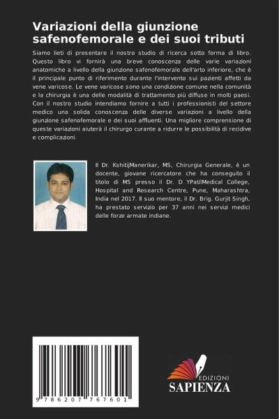 Siamo lieti di presentare il nostro studio di ricerca sotto forma di libro. Questo libro vi fornirà una breve conoscenza delle varie variazioni anatomiche a livello della giunzione safenofemorale dell'arto inferiore, che è il principale punto di riferimento durante l'intervento sui pazienti affetti da vene varicose. Le vene varicose sono una condizione comune nella comunità e la chirurgia è una delle modalità di trattamento più diffuse in molti paesi. Con il nostro studio intendiamo fornire a tutti i professionisti del settore medico una solida conoscenza delle diverse variazioni a livello della giunzione safenofemorale e dei suoi affluenti. Una migliore comprensione di queste variazioni aiuterà il chirurgo curante a ridurre le possibilità di recidive e complicazioni.