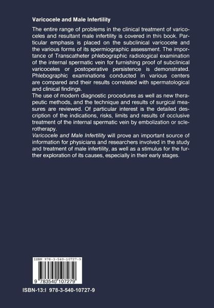 I. Epidemiology.- Epidemiology of Idiopathic Varicocele.- II. Basic Aspects.- Pathogenesis of Varicocele.- The Varicocele: Clinical Aspects.- "Orchipathia e varicocele".- Histological, Morphometrical, and Enzyme Histochemical Studies on Varicocele Orchiopathy.- Varicocele and Seminal Cytology.- Cases Illustrating the Variation of Results.- III. Diagnosis.- A. Phlebography.- Technique of Retrograde Phlebography of the Internal Spermatic Vein.- Radiologic Anatomy of the Left Testicular Vein in Varicoceles.- Phlebography of the Right Spermatic Vein in Varicoceles.- Technique, Indications, and Results of Transfemoral Phlebography of the Testicular Vein in Persistent Varicocele.- B. Other Methods.- The Value of Physical Examination for the Diagnosis of Varicocele.- Contact Thermography in the Diagnosis of Varicocele.- The Doppler Technique for the Diagnosis of Varicocele.- Diagnosis and Differential Diagnosis of Varicocele by Ultrasound.- Comparison Between Different Methods for the Diagnosis of Varicocele.- IV. Endocrinology and Immunology.- Hormone Levels and Sperm Counts in Patients with Varicocele.- Testosterone in Peripheral Plasma, Spermatic Veins, and Testicular Tissue of Patients with Varicocele.- Varicocele Operation and Endocrine Parameters.- Hormonal Testicular Function in Patients with Varicocele.- Enhanced Chemotactic Activity of Microphages in Varicocele.- V. Therapy.- A. Surgical Treatment.- Surgical Treatment of Varicocele.- Recidivation of Varicocele, Prophylaxis, and Therapy.- Persisting Varicocele: Cause and Treatment.- B. Sclerotherapy.- Results of Transfemoral Testicular Vein Obliteration Using a Balloon Catheter.- Sclerotherapy: Technique and Results.- C. Embolization.- The Treatment of Idiopathic Varicocele by Transfemoral Spiral Occlusion of theLeft Testicular Vein.- Treatment of Varicoceles by Embolization with Detachable Balloons.- Nonsurgical Cure of Varicocele by Transcatheter Embolization of the Internal Spermatic Vein with Bucrylate.- Modified Technique for Embolization of the Internal Spermatic Vein.- D. Complications and Risks.- Complications of Surgery for Varicocele.- Complications and Risks of Percutaneous Sclerotherapy.- VI. Results.- Long-Term Results after Surgical Treatment of an Idiopathic Varicocele.- Spermatologic Results Preceding and Following Varicocele Surgery.- Treatment of Idiopathic Varicoceles by Transfemoral Testicular Vein Occlusion.- Effects of Percutaneous Sclerosis of the Left Internal Spermatic Vein on Semen Quality.- VII. Discussion.- Phlebography of Persistent Varicocele in Boys.
