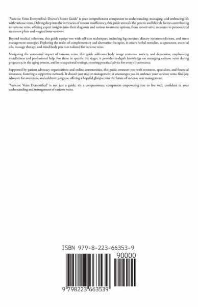 "Varicose Veins Demystified: Doctor's Secret Guide" is your comprehensive companion to understanding, managing, and embracing life with varicose veins. Delving deep into the intricacies of venous insufficiency, this guide unravels the genetic and lifestyle factors contributing to varicose veins, offering expert insights into their diagnosis and various treatment options, from conservative measures to personalized treatment plans and surgical interventions. Beyond medical solutions, this guide equips you with self-care techniques, including leg exercises, dietary recommendations, and stress management strategies. Exploring the realm of complementary and alternative therapies, it covers herbal remedies, acupuncture, essential oils, massage therapy, and mind-body practices tailored for varicose veins. Navigating the emotional impact of varicose veins, this guide addresses body image concerns, anxiety, and depression, emphasizing mindfulness and professional help. For those in specific life stages, it provides in-depth knowledge on managing varicose veins during pregnancy, in the aging process, and in occupational settings, ensuring practical advice for every circumstance. Supported by patient advocacy organizations and online communities, this guide connects you with resources, specialists, and financial assistance, fostering a supportive network. It doesn't just stop at management; it encourages you to embrace your varicose veins, find joy, advocate for awareness, and celebrate progress, offering a hopeful glimpse into the future of varicose vein management. "Varicose Veins Demystified" is not just a guide; it's a compassionate companion empowering you to live well, confident in your understanding and management of varicose veins.