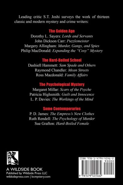 Leading critic S.T. Joshi reviews surveys the work of 13 mystery and crime writers, ranging from the Golden Age, Hardboiled school, the Psychological Mystery, and Contemporary Writers. The Golden Age Dorothy L. Sayers: Lords and Servants John Dickson Carr: Puzzlemeister Margery Allingham: Murder, Gangs, and Spies Philip MacDonald: Expanding the "Cosy" Mystery II. The Hard-Boiled School Dashiell Hammett: Sam Spade and Others Raymond Chandler: Mean Streets Ross Macdonald: Family Affairs III. The Psychological Mystery Margaret Millar: Scars of the Psyche Patricia Highsmith: Guilt and Innocence L. P. Davies: The Workings of the Mind Some Contemporaries P. D. James: The Empress’s New Clothes Ruth Rendell: The Psychology of Murder Sue Grafton: Hard-Boiled Female
