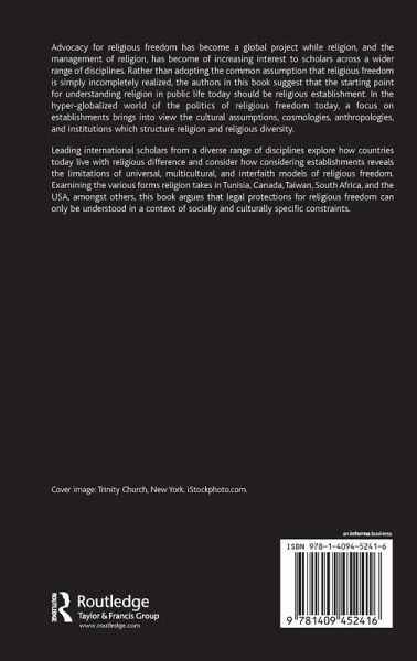 Advocacy for religious freedom has become a global project while religion, and the management of religion, has become of increasing interest to scholars across a wider range of disciplines. Rather than adopting the common assumption that religious freedom is simply incompletely realized, the authors in this book suggest that the starting point for understanding religion in public life today should be religious establishment. In the hyper-globalized world of the politics of religious freedom today, a focus on establishments brings into view the cultural assumptions, cosmologies, anthropologies, and institutions which structure religion and religious diversity. Leading international scholars from a diverse range of disciplines explore how countries today live with religious difference and consider how considering establishments reveals the limitations of universal, multicultural, and interfaith models of religious freedom. Examining the various forms religion takes in Tunisia, Canada, Taiwan, South Africa, and the USA, amongst others, this book argues that legal protections for religious freedom can only be understood in a context of socially and culturally specific constraints.