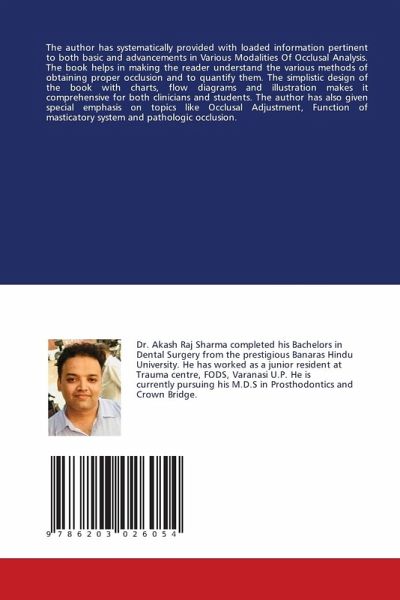 The author has systematically provided with loaded information pertinent to both basic and advancements in Various Modalities Of Occlusal Analysis. The book helps in making the reader understand the various methods of obtaining proper occlusion and to quantify them. The simplistic design of the book with charts, flow diagrams and illustration makes it comprehensive for both clinicians and students. The author has also given special emphasis on topics like Occlusal Adjustment, Function of masticatory system and pathologic occlusion.