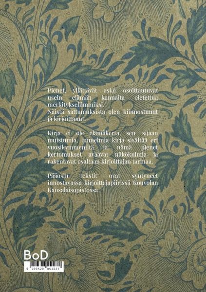 Pienet, yllättävät asiat osoittautuvat usein elämän kannalta oletettua merkityksellimmiksi. Näistä sattumuksista olen kiinnostunut ja kirjoittanut. Kirja ei ole elämäkerta, sen sijaan muistumia, tunnelmia kirja sisältää eri vuosikymmeniltä ja nämä pienet kertomukset avaavat näkökulmia ja rakentavat osaltaan kirjoittajan tarinaa. Pääosin tekstit ovat syntyneet innostavassa kirjoittajapiirissä Kouvolan Kansalaisopistossa